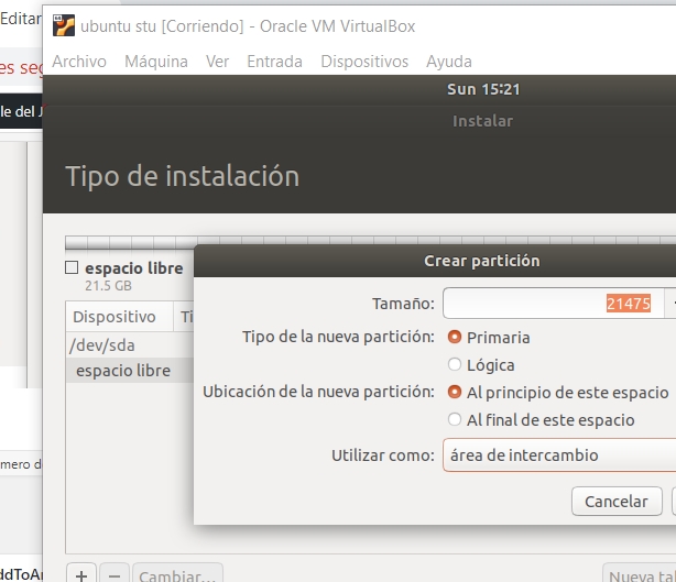 Creamos la primera partición de 1GB primaria, la utilizaremos como área de intercambio (swap):