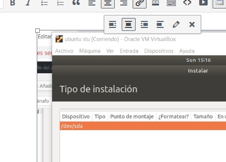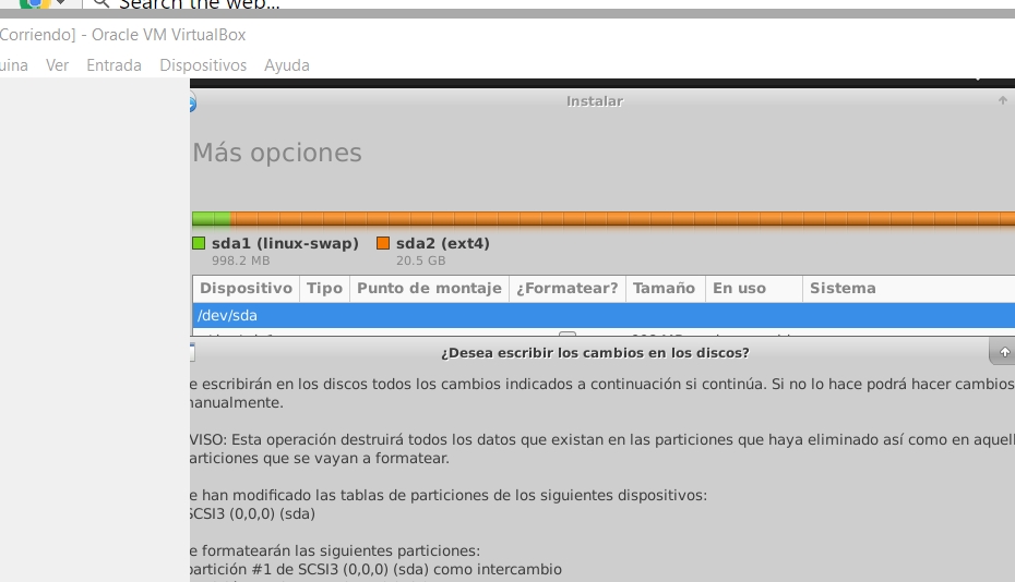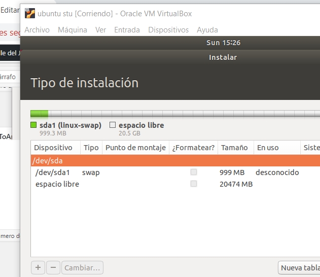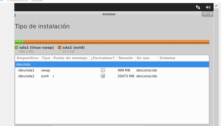 En el espacio libre añadimos una partición de tipo lógica y la configuramos como ext4 y montamos la raíz (/):