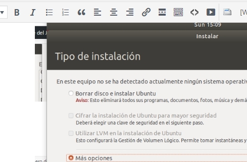 Seleccionamos «Más opciones», para particionar el disco a nuestro gusto:
