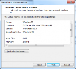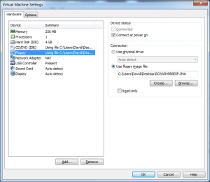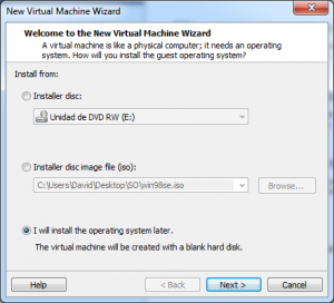 Luego deberemos configurar una unidad floppy con el disco de arranque y una unidad de CD/DVD con el disco de instalación de windows 98: