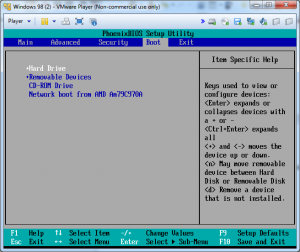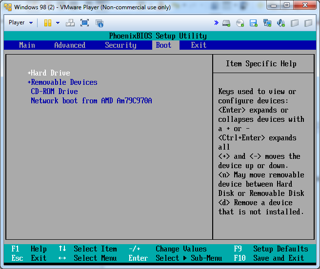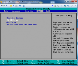 Iniciamos la máquina virtual y nos metemos en la BIOS, en las opciones del BOOT ponemos en primer lugar a la unidad floopy y en segundo a la unidad CD-ROM, pulsamos F10 para guardar y salir: