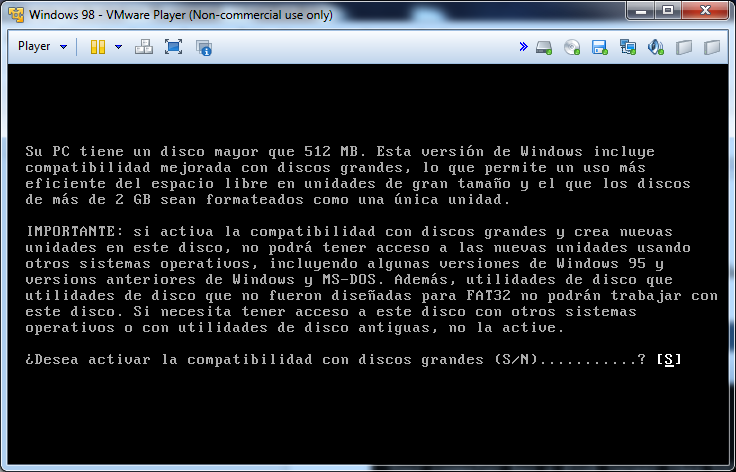 Nos preguntara si queremos activar la compatibilidad para disco grandes (mayores de 512MB) escribiremos S y le damos a Intro:
