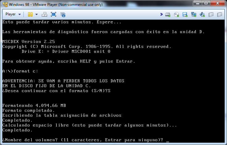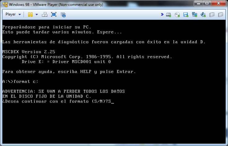Una vez estemos de nuevo en MS-DOS del disco de arranque escribimos «format c:» para dar formato a la partición: