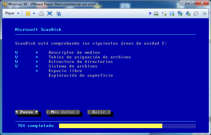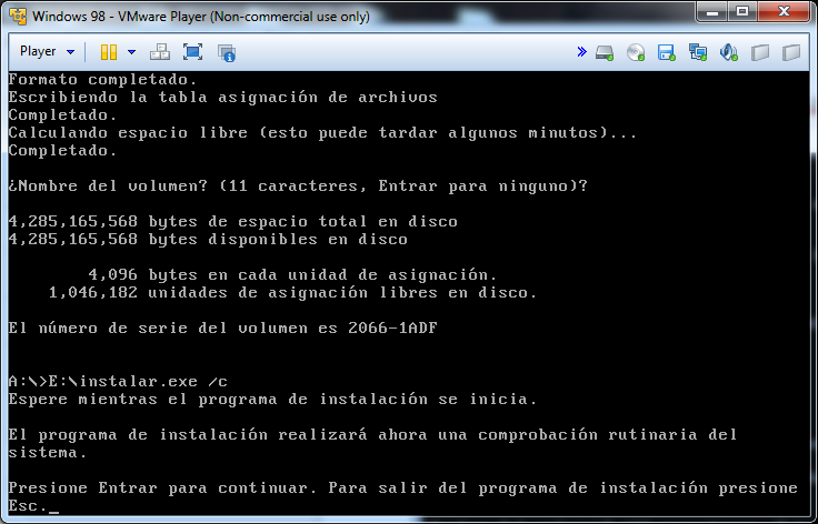 Cuando termine de formatear iniciaremos la instalación de windows 98, para ello deberemos escribir en el MS-DOS: «E:\instalar.exe /c» y pulsamos intro: