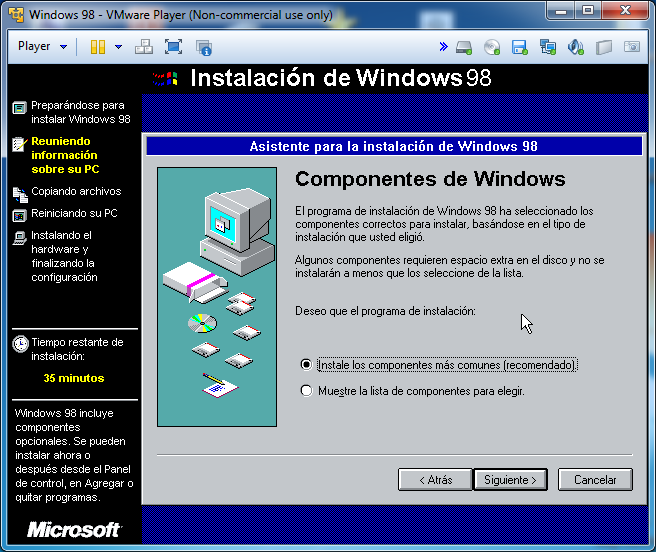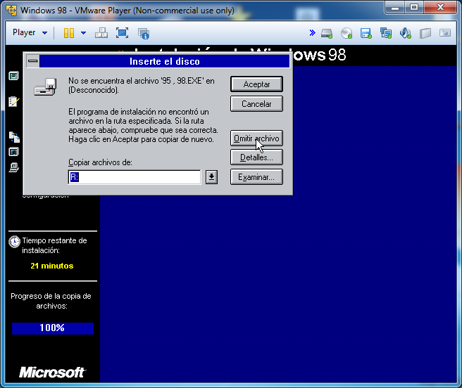 Si nos da un error de que no encuentra el archivo ’95 , 98.EXE’ lo ignoramos, le damos a Omitir archivo:
