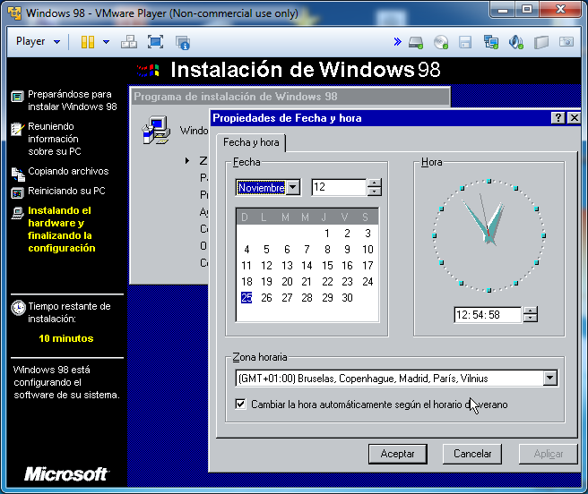 Nos preguntará la fecha y la hora, las configuramos, le damos a aplicar y luego a aceptar para continuar: