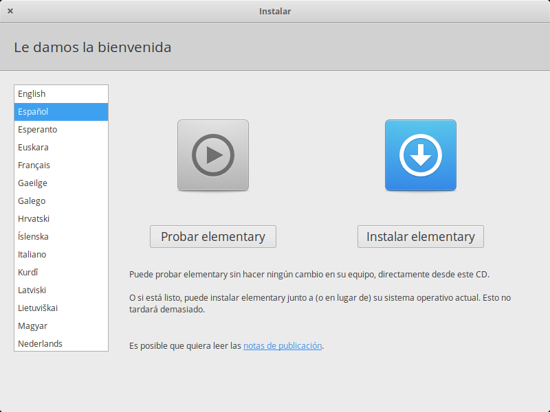 Elementary OS nos ofrece la opcion de trabajar con este sistema operativo sin necesidad de instalarlo(Live CD)