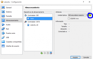 5. En este paso insertaremos la ISO, vamos a configuración, almacenamiento, debajo de controlador: IDE pulsaremos click sobre vacío y pulsamos sobre insertar un disco óptico virtual que en mi caso esta señalado con azul.