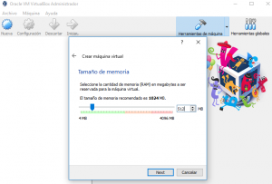 3. Le asignamos la memoria Ram de nuestro sistema operativo con 512MB de funciona bien.