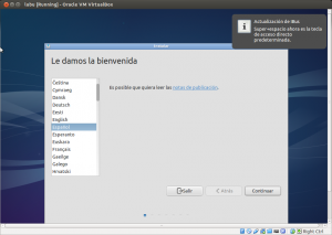 8. Se inicia el entorno gráfico dándonos la bienvenida, en caso de que no este seleccionado el idioma escogemos el idioma que prefiramos en mi caso (Español). Damos click al botón Continuar.