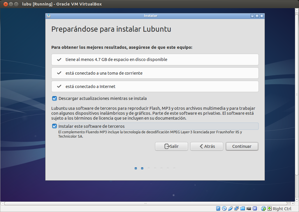 9. Un rápido chequeo de requerimientos para la instalación nos pide tener espacio en disco, estar conectados a una toma de corriente, conectado a internet. Marcamos ademas las opciones de descarga de actualizaciones e instalar software. Estas opciones aunque no son obligatorias tenerlas todas activas es mejor cumplir con ellas para que la instalación sea sin errores. Damos click al botón Continuar.