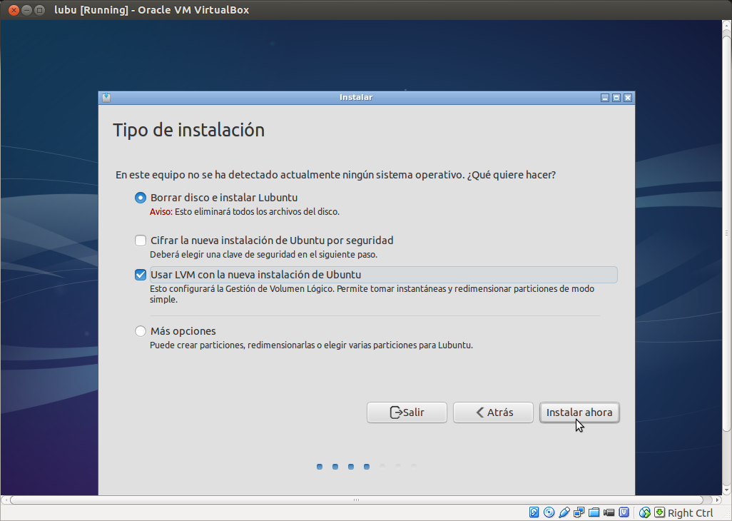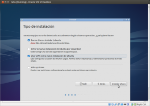 10. En este momento hay que decidir el particionado del disco, en nuestro caso usaremos marcando la primera opción y agregando el uso de LVM por si acaso algún día nos quedaremos sin espacio en el disco duro poder agregar mas espacio (si queremos tener mas control sobre el particionado, debemos entrar por Mas opciones). Damos click al botón Instalar ahora.