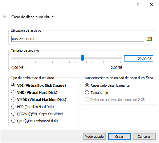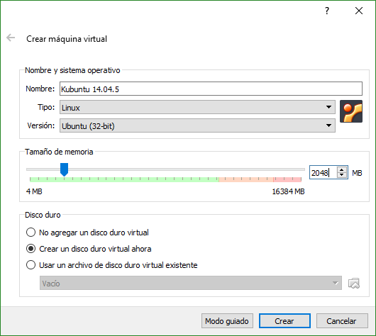 Lo primero que haremos será crear una nueva máquina virtual, seleccionando el tipo y la versión adecuada para el sistema operativo, dotándola de 2GB de memoria RAM y 20GB de Disco Duro.