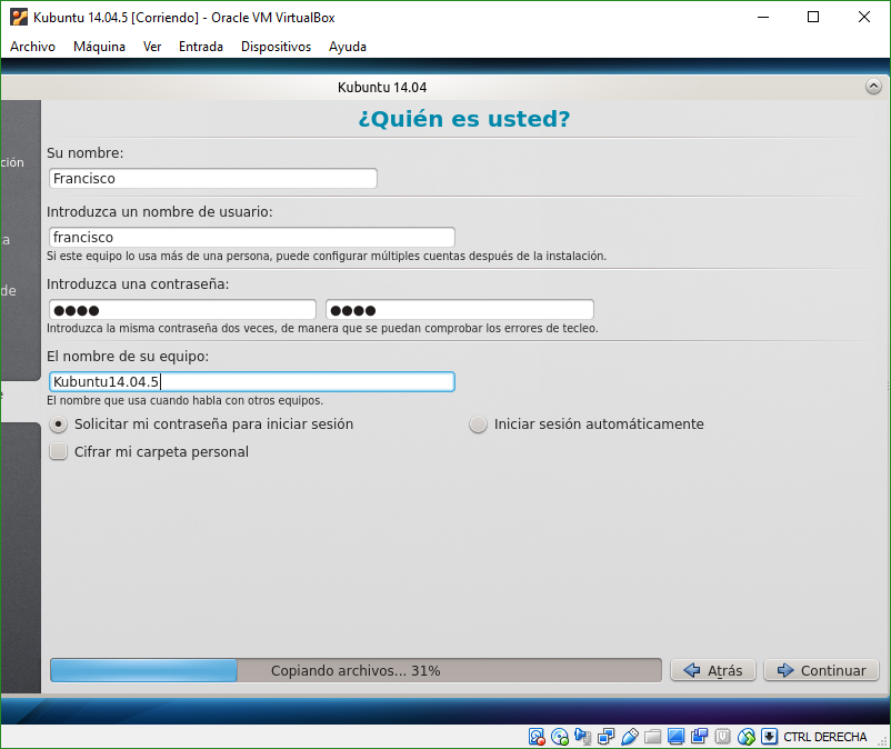 Ahora tocaría esperar a que se instale todo. Una vez instalado, apagamos la máquina y entramos en Configuración>Almacenamiento, y quitamos el ISO de Kubuntu.