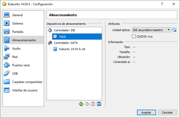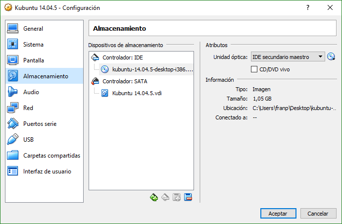 Una vez creada la máquina virtual, entraremos en la Configuración, y dentro iremos a Almacenamiento. Ahí insertamos el ISO de Kubuntu para realizar la instalación.