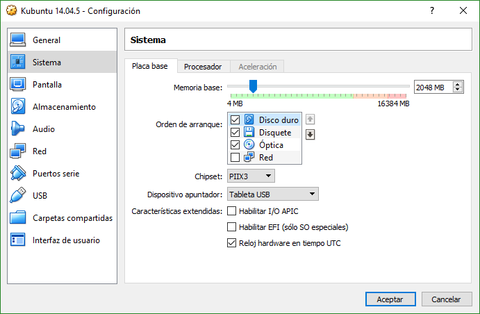 Y para que la máquina arranque más rápido y no haya problemas al arrancar, nos vamos a Sistema, colocamos en el Orden de Arranque primero el Disco Duro y guardamos la configuración.