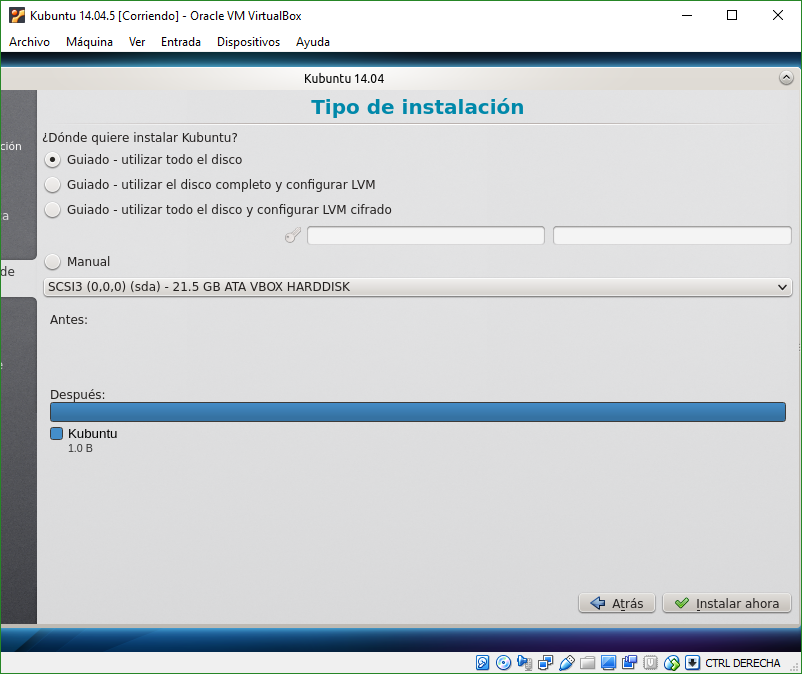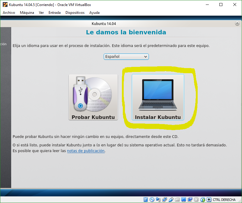 Una vez realizado el paso anterior, iniciamos la máquina y nos saldrán dos opciones, una para probar Kubuntu sin realizar la instalación, y para instalar Kubuntu. Nosotros seleccionaremos la segunda opción, Instalar Kubuntu.