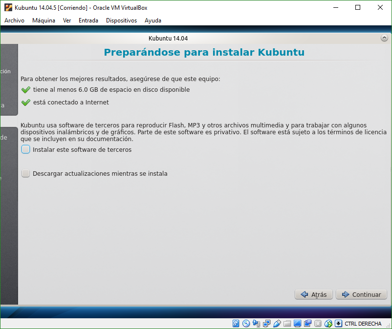 En la instalación, seleccionaremos que no queremos instalar software de terceros ni descargar actualizaciones.