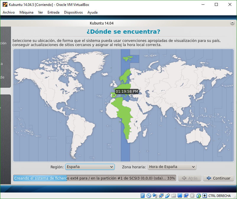 Mientras se instala el SO, nos va a preguntar por la zona horaria, la cual seleccionaremos dependiendo en el país en el que nos encontremos, en mi caso España.