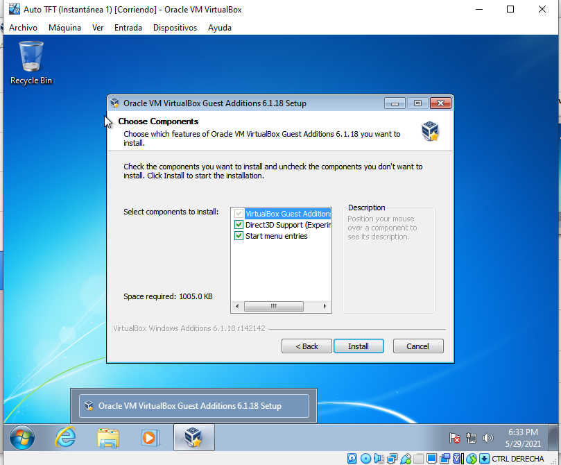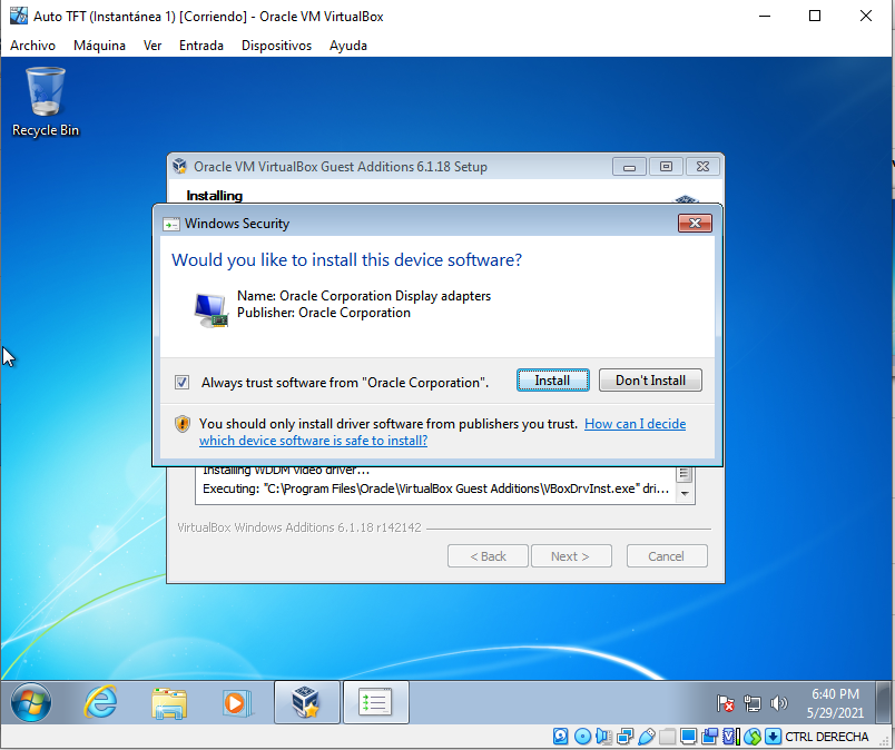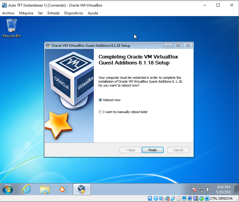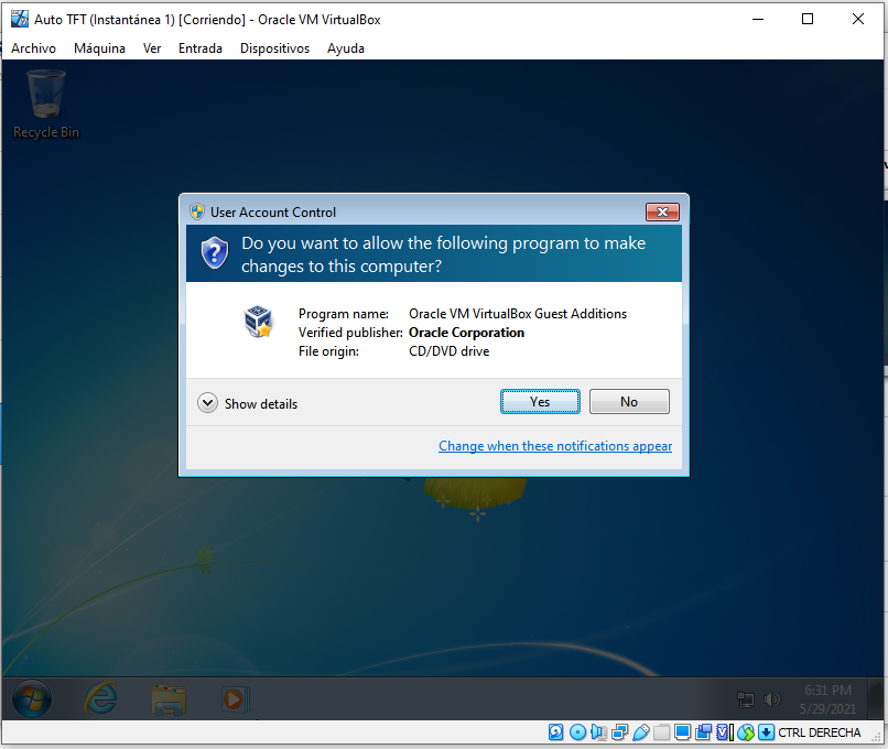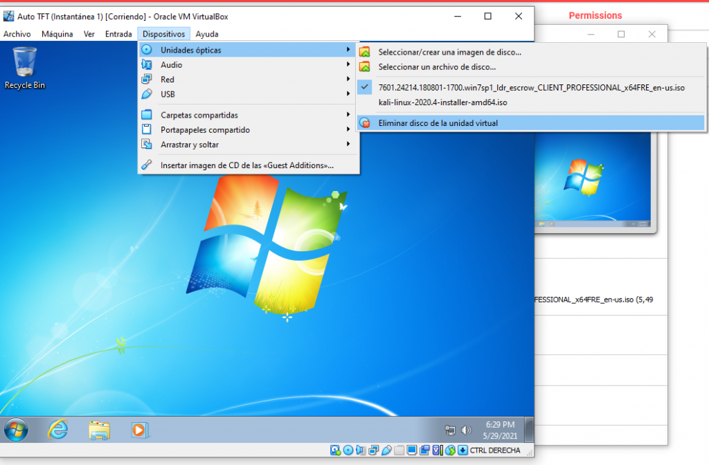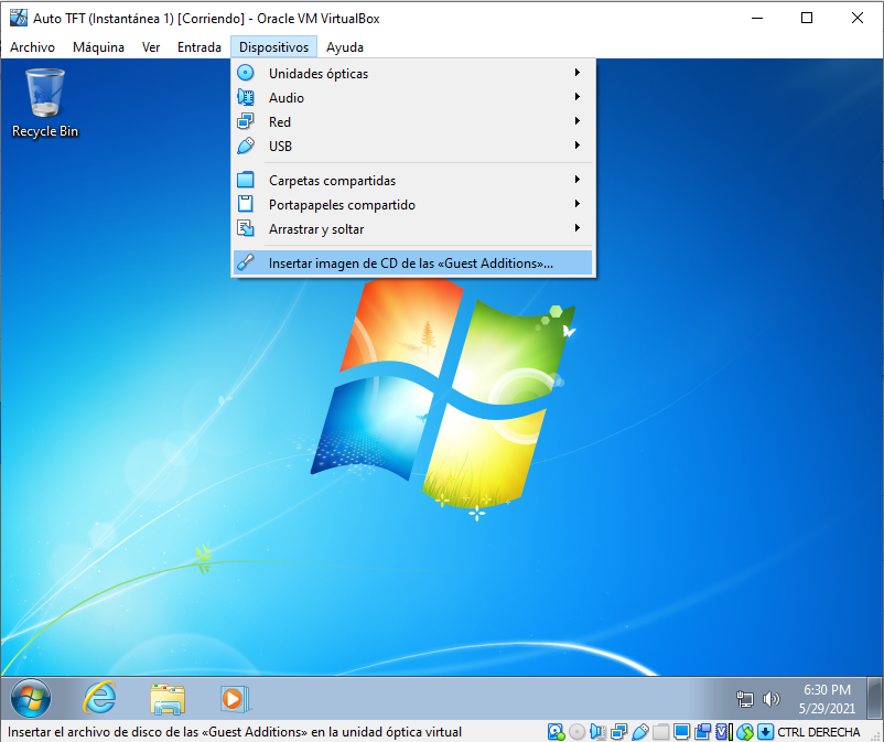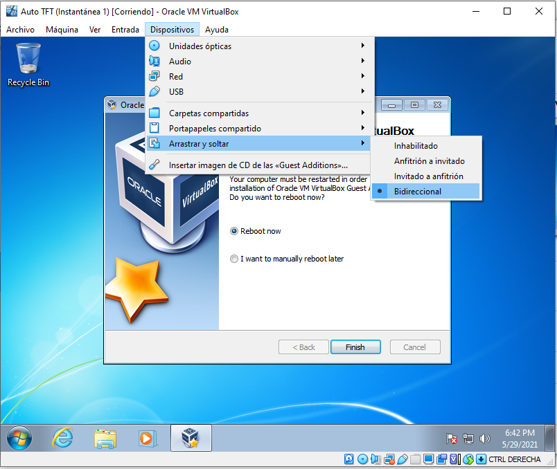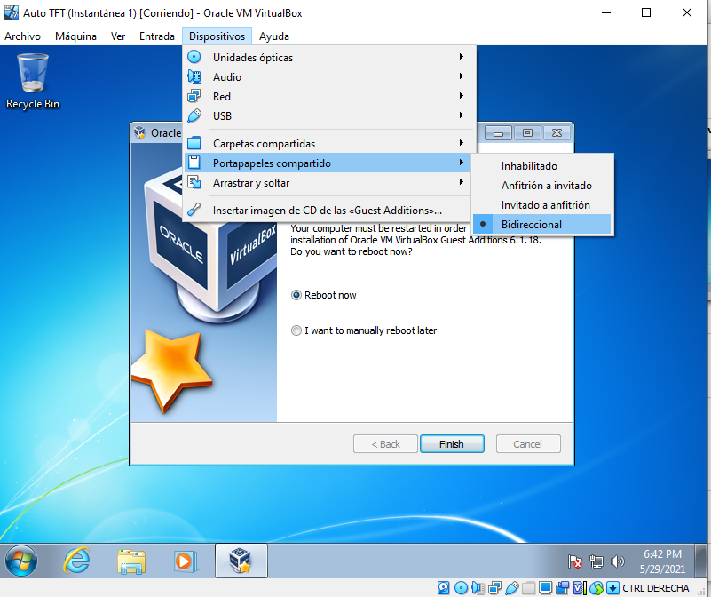 Una vez instalado le damos a extraer el disco, metemos las guest aditions y activamos el portapapeles bidireccional y el arrastrar y soltar bidireccional. Hay que reiniciar después de que se instale.