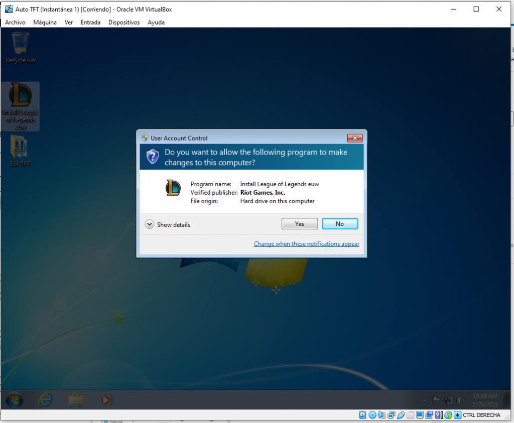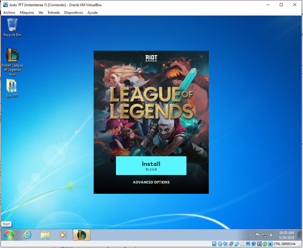 Ahora toca descargar el instalador de league of legends y el bot del tft en el anfitrión para posteriormente arrastrarlo dentro de la máquina virtual. Es importante que el bot tft esté descomprimido, pues la máquina virtual no puede trabajar con esos archivos. También se recomienda quitar temporalmente el antivirus del anfitrión por si se queja del bot del tft.