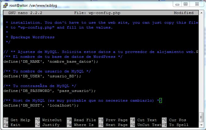 Una diferencia con respecto al tutorial de Joomla es que el archivo de configuracion en WordPress se llama wp-config.php y en éste donde debemos cambiar los datos de la BD es en los siguientes: