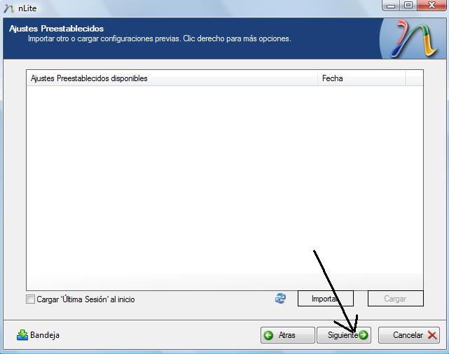 Esta pantalla es para cargar una configuración ya hecha con nlite, pero como es la primera vez no tengo ninguna configuración guardada, le damos a siguiente.