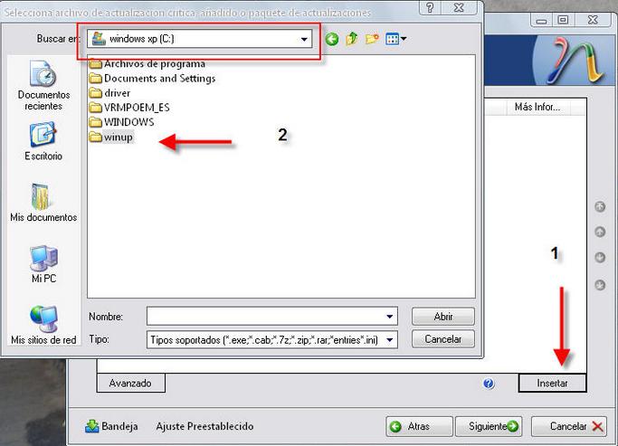 Como podéis ver en la imagen podemos integrar las actualizaciones, solo tenemos que pinchar en insertar (la flecha numero1) y empezamos a integrar las actualizaciones, que hemos descargado anterior mente con el winup.