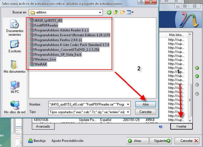 Ahora si queréis integrar programas de la pagina winaddons solo tenéis que pinchar en insertar y buscar la carpeta addons que hemos creado antes y tratarlo como una actualización mas: