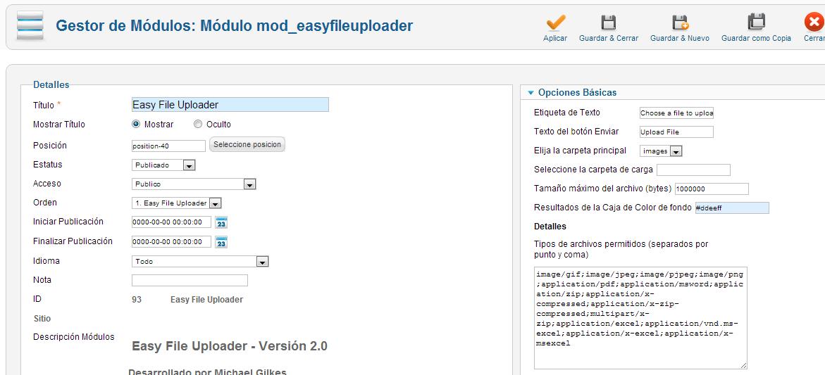 Easy File Uploader es un módulo desarrollado para joomla 1.5 y joomla 2.5 con el cual todos los usuarios del sitio joomla podemos subir mediante un pequeño formulario archivos a una carpeta específica de nuestro servidor. Dispone de varias opciones de configuración, además de personalización css.