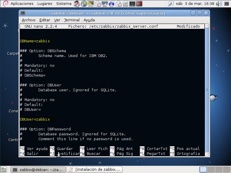 Editamos el fichero de configuración del servidor Zabbix para declarar los parámetros de conexión a la base de datos MySQL. Para ello como root ejecutamos los siguientes comandos: