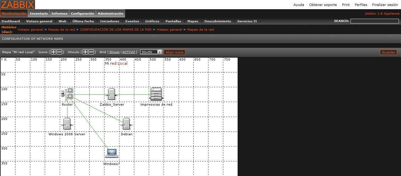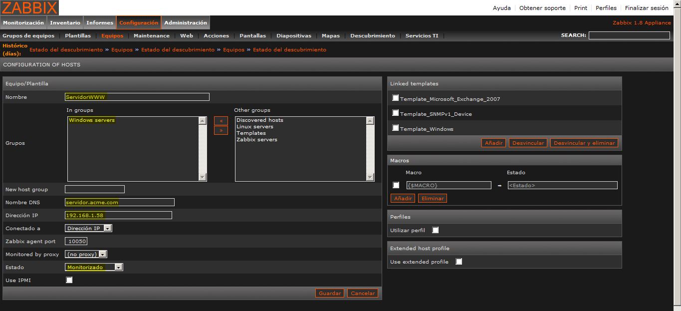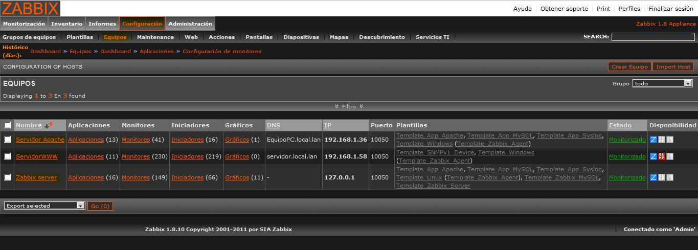 Después de introducir los datos referentes a los equipos que queremos controlar, también podemos añadir plantillas(templates) las cuales nos permiten supervisar ciertos procesos del sistema. Ahora podemos ver los equipos que estamos monitorizando.