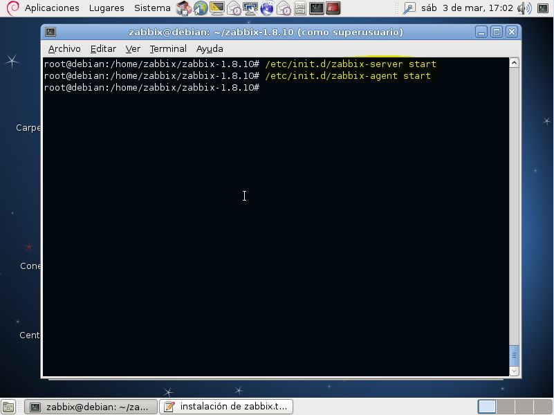 Ahora iniciamos Zabbix tanto el servidor como agente con los scripts de inicio configurados. Por lo tanto como root ejecutamos estos comandos: