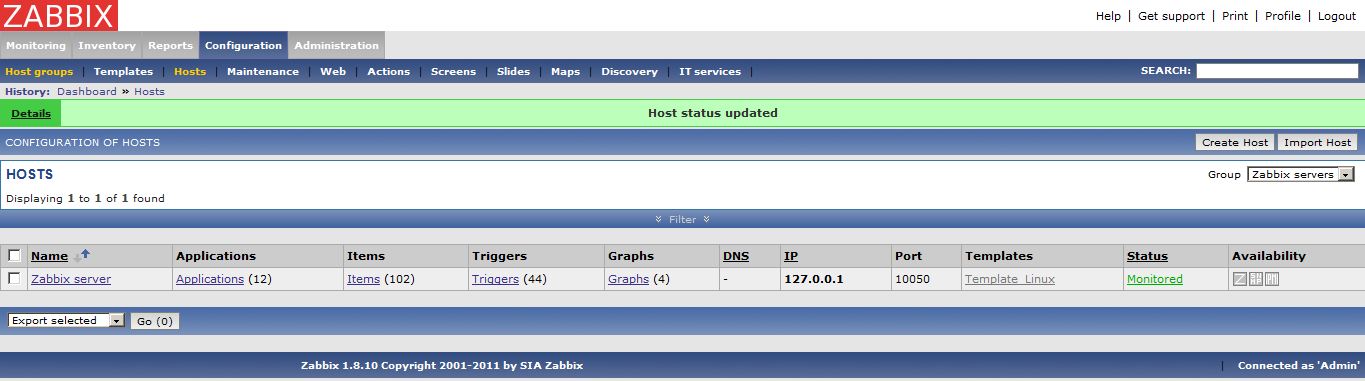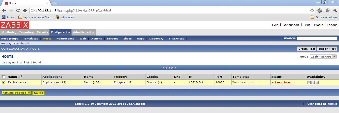 Para activar el servidor, accedemos a la pestaña Configuración | Hosts seleccionamos el servidor y lo activamos pulsando Go.