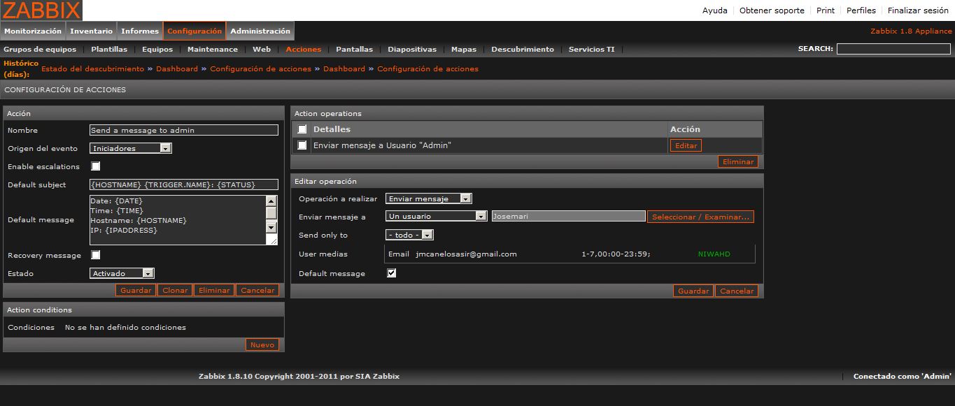 Como buen sistema de monitorización, zabbix nos permite enviar alertas a los usuarios o grupos de usuarios que especifiquemos. Las alertas pueden ser por correo electrónico, sms, etc.