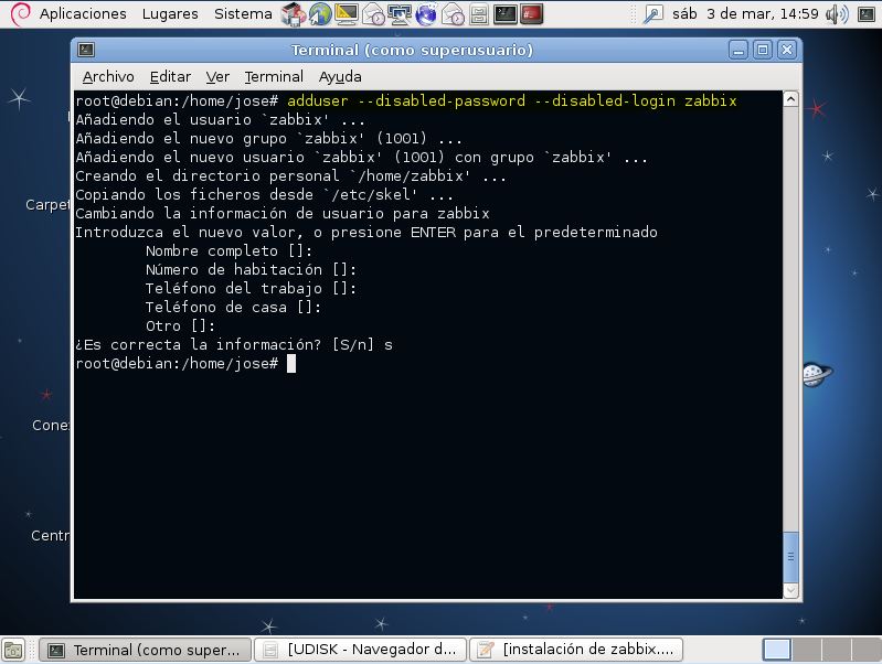 El siguiente paso, será la creación del  usuario zabbix, necesario para el funcionamiento seguro del sistema. Para ello ejecutamos el siguiente comando como root y dejamos todas las opciones como aparecen de forma predeterminada: