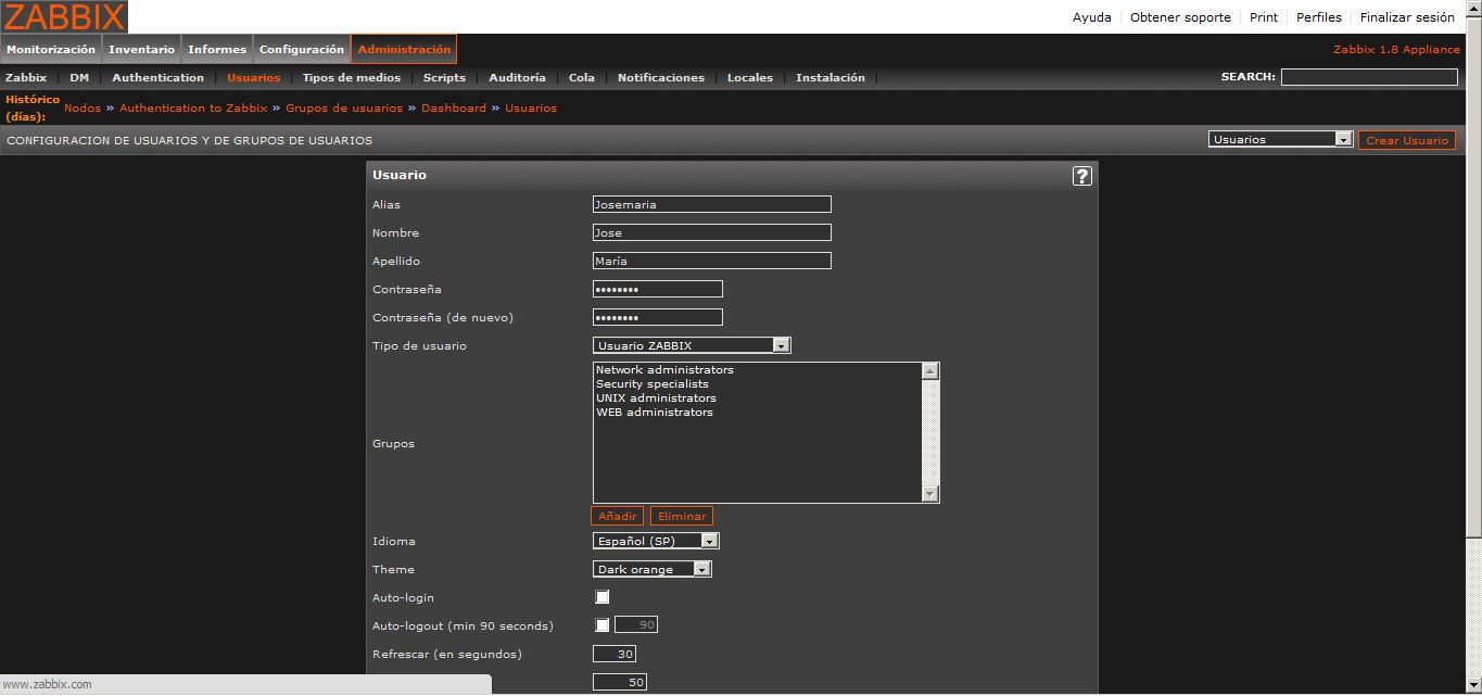 Zabbix nos permite crear usuarios y asignarle a uno varios grupos para así otorgarle diferentes permisos de acuerdo al tipo de perfil que deseemos crear.
