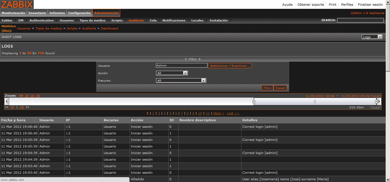 Además nos permite llevar un control de los accesos mediante un log. Pudiendo filtrar los eventos por usuarios, etc.