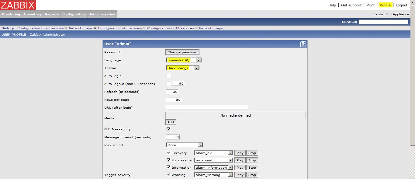 Zabbix permite personalizar su interfaz, cambiar el idioma, etc, simplemente accediendo a las propiedades del perfil de usuario y seleccionando los valores deseados:
