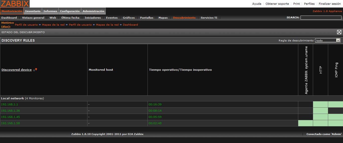 De esta manera si accedemos a la pestaña Monitorización | Descubrimiento podemos ver los equipos conectados a la red.