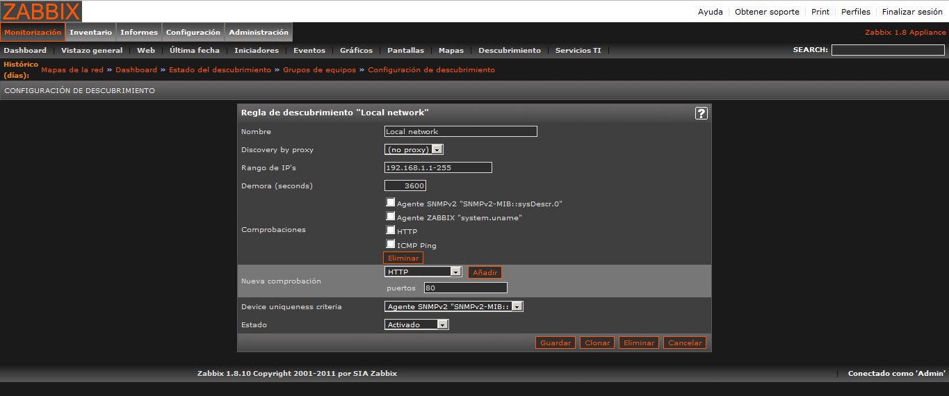Como podemos ver en la siguiente captura, la apariencia ha cambiado totalmente. Un aspecto que hace a zabbix muy interesante es la capacidad de descubrir los hosts de la red de forma automática. Para ello, se activa el rango de red que se quiere administrar.