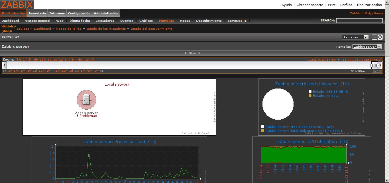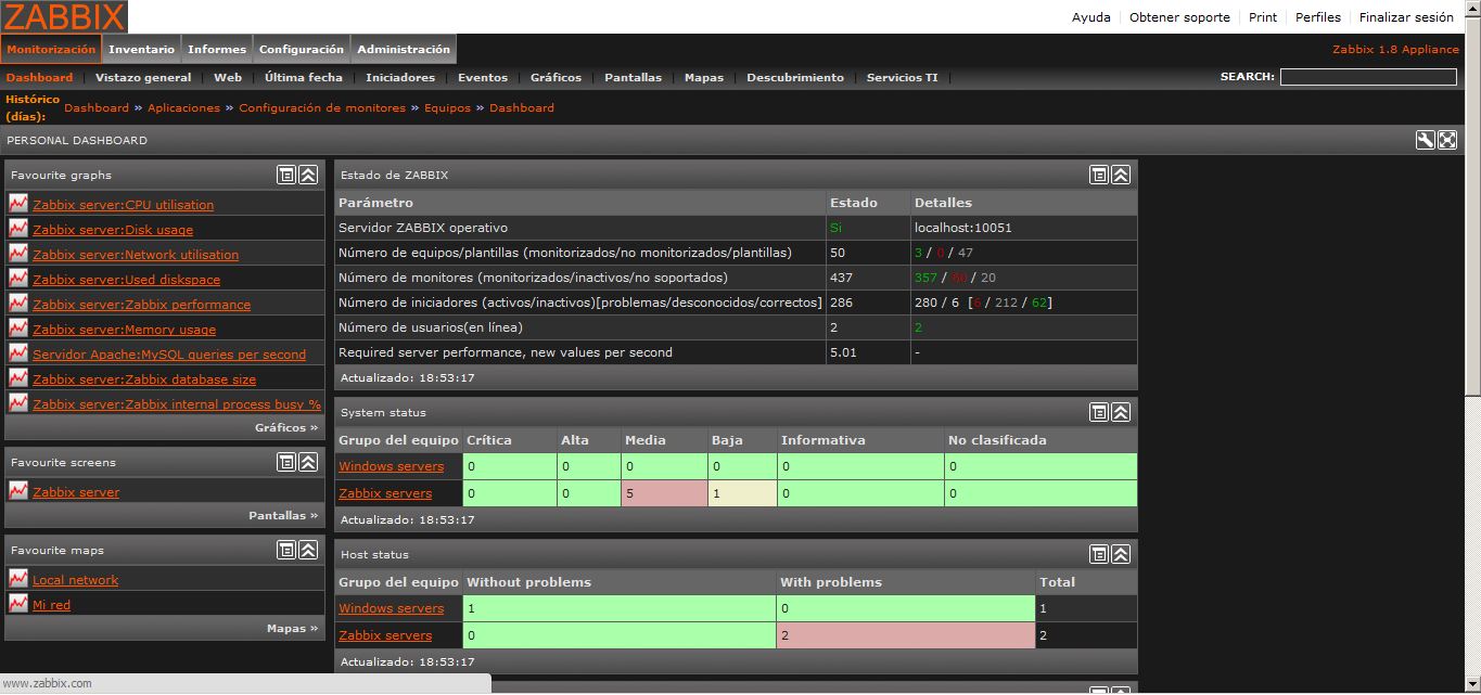 En la pestaña principal Monitorización | Dashboard podemos ver un conjunto de valores sobre el funcionamiento de los equipos de la red.