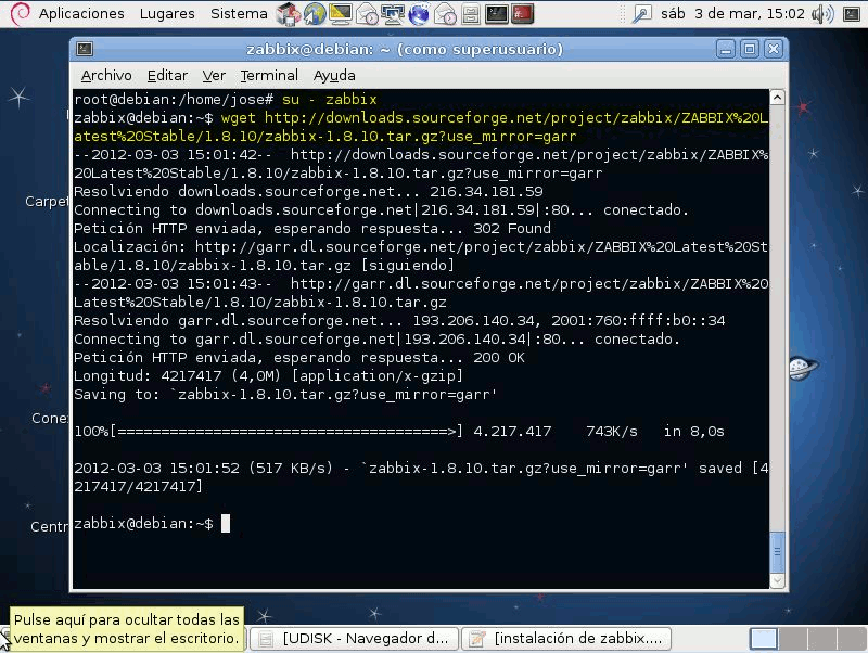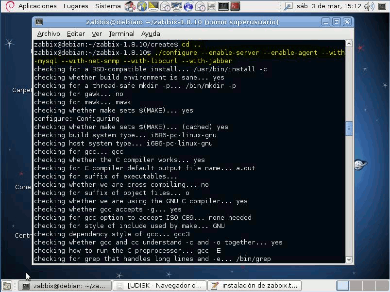 Ahora vamos a compilar e instalar las fuentes, para ello ejecutamos los siguientes comandos como zabbix y root: