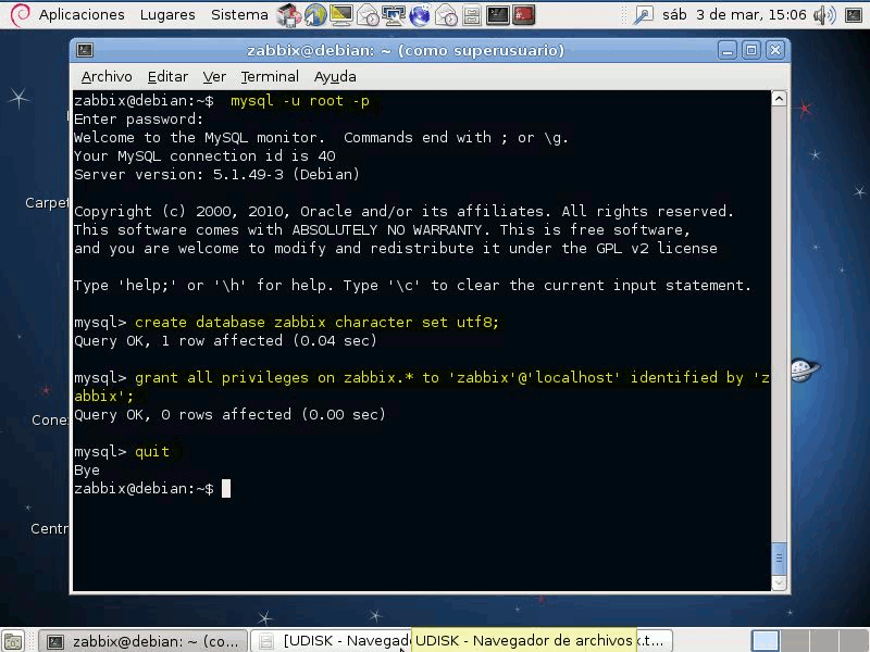 mysql -p zabbix < schema/mysql.sql     # Introducir contraseña del root MySQL