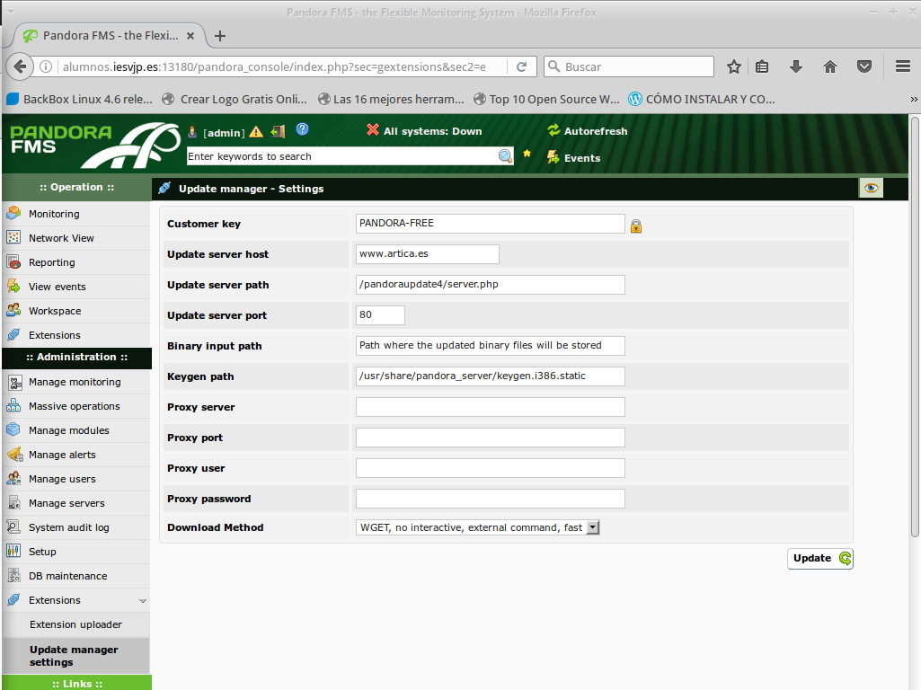 -> Pandora FMS tiene un sistema automático de actualización para mantener la consola actualizada a través de los builds automáticos de la versión estable. En la versión “open” estos parches no están certificados ni soportados de forma oficial. Son cómodos de aplicar y no interrumpen la operación. Rellenaremos los datos, y no los descargaría con WGET y instalaría