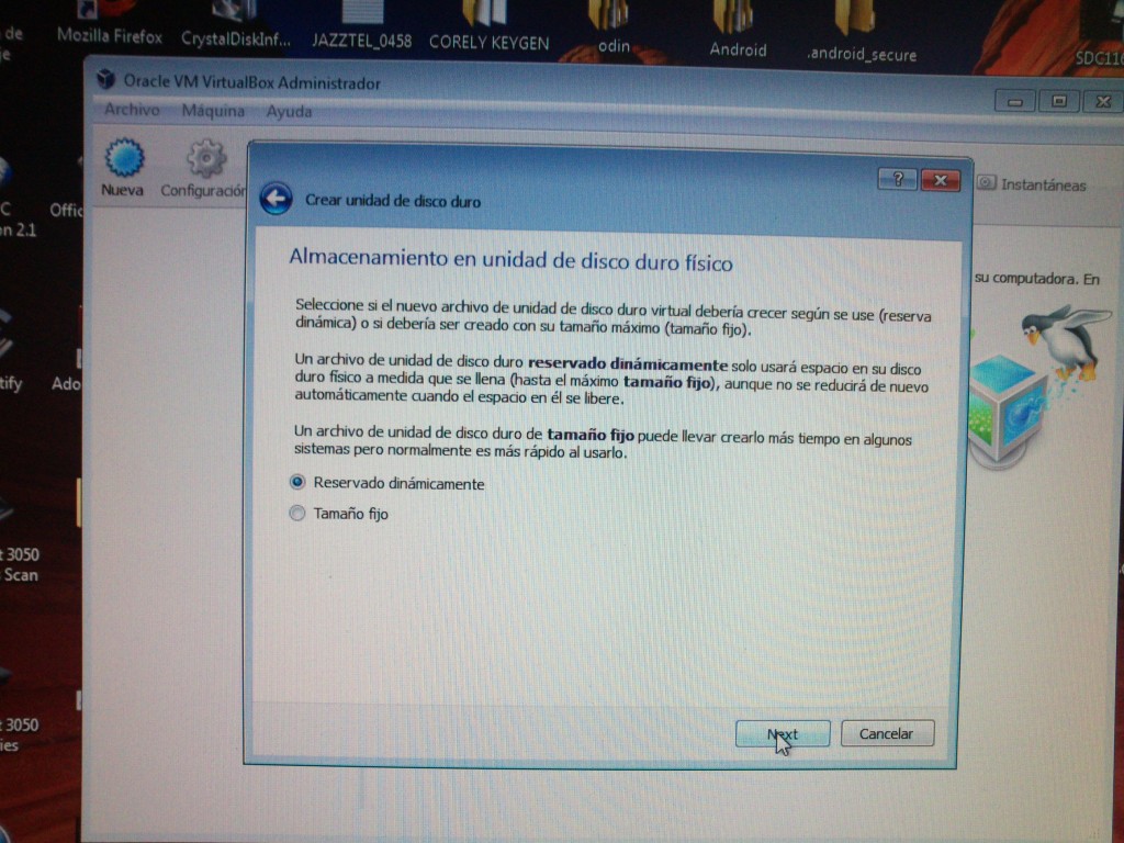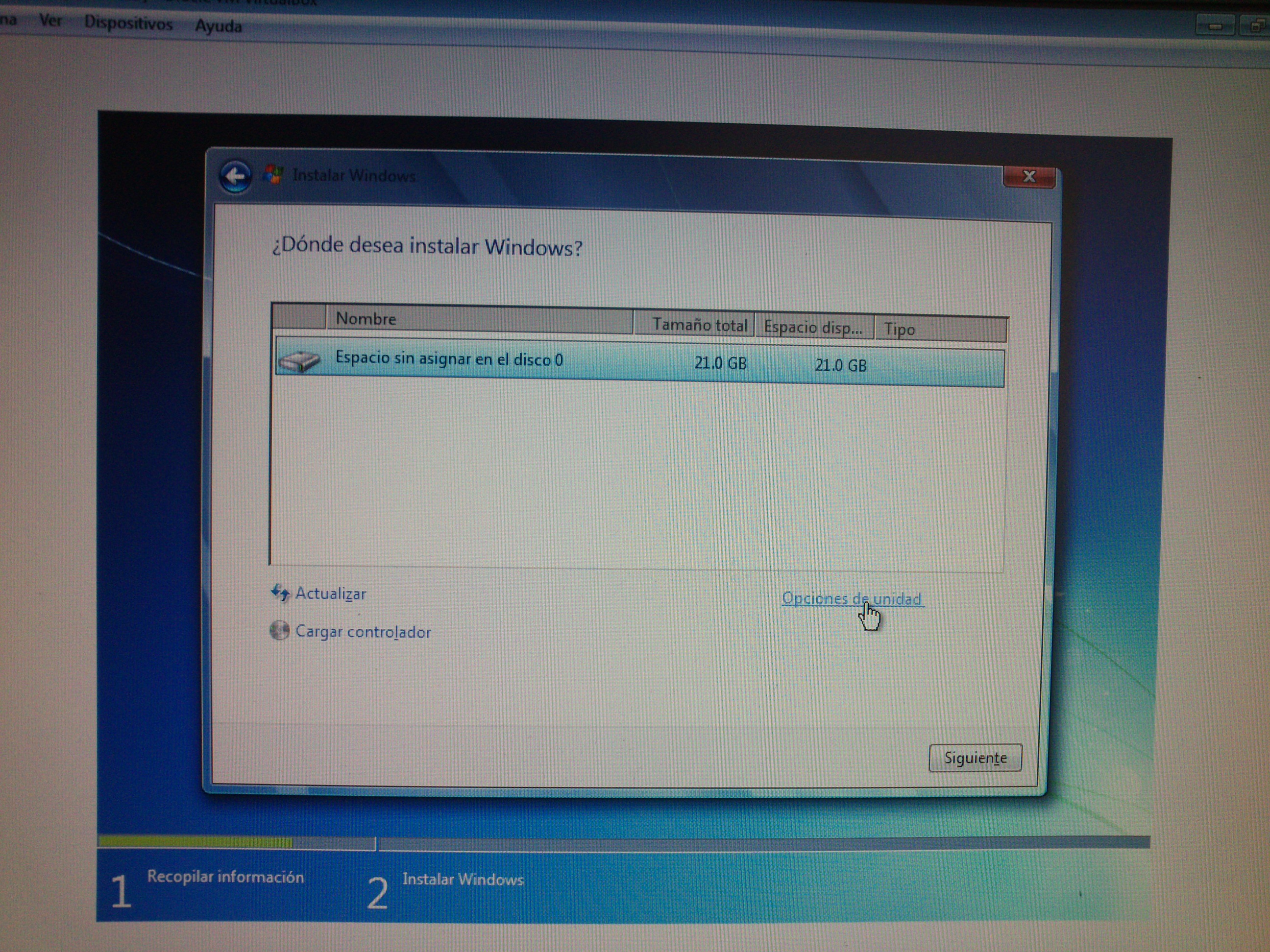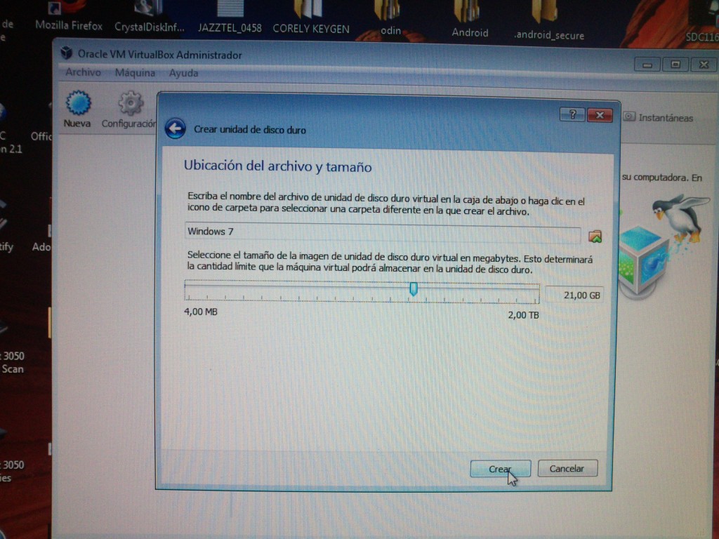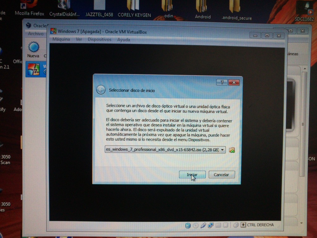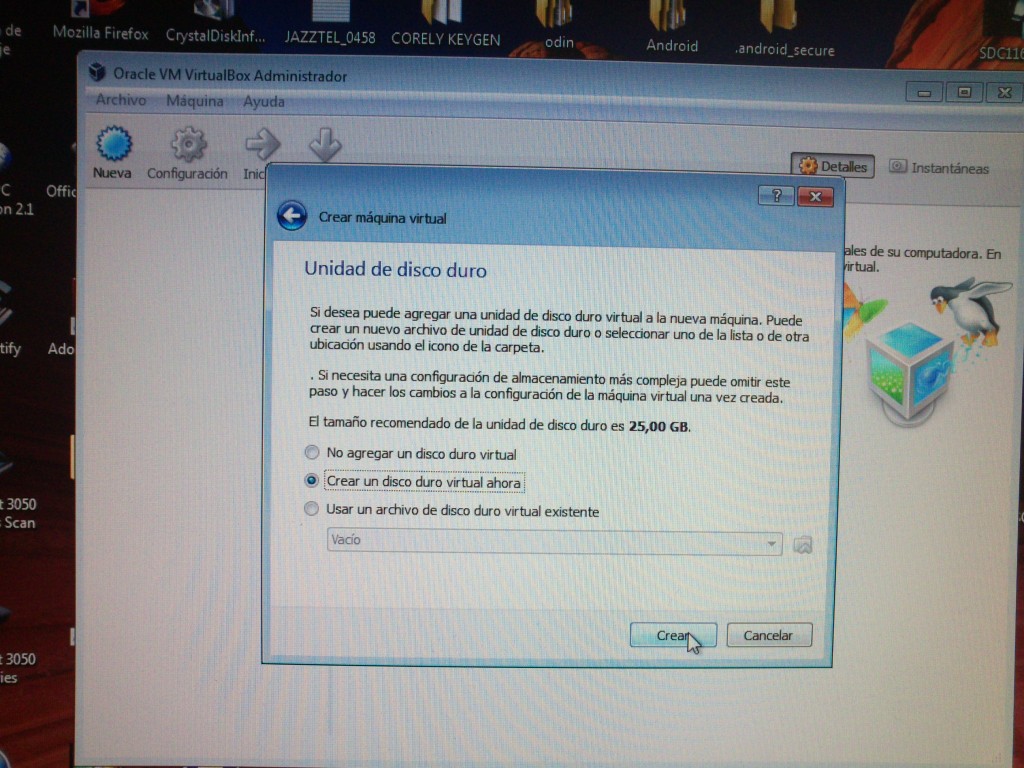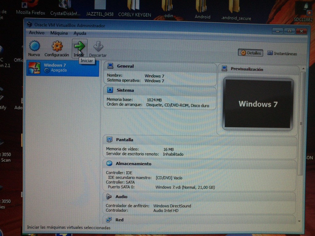 Le damos 20 GB de H.D y con esto ya tendriamos creada la «maquina virtual» para poder intalar el S.O. Una vez termiando con lo anterior, le damos a iniciar o doble click en la maquina creada para poder instalar el S.O.