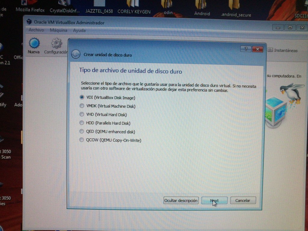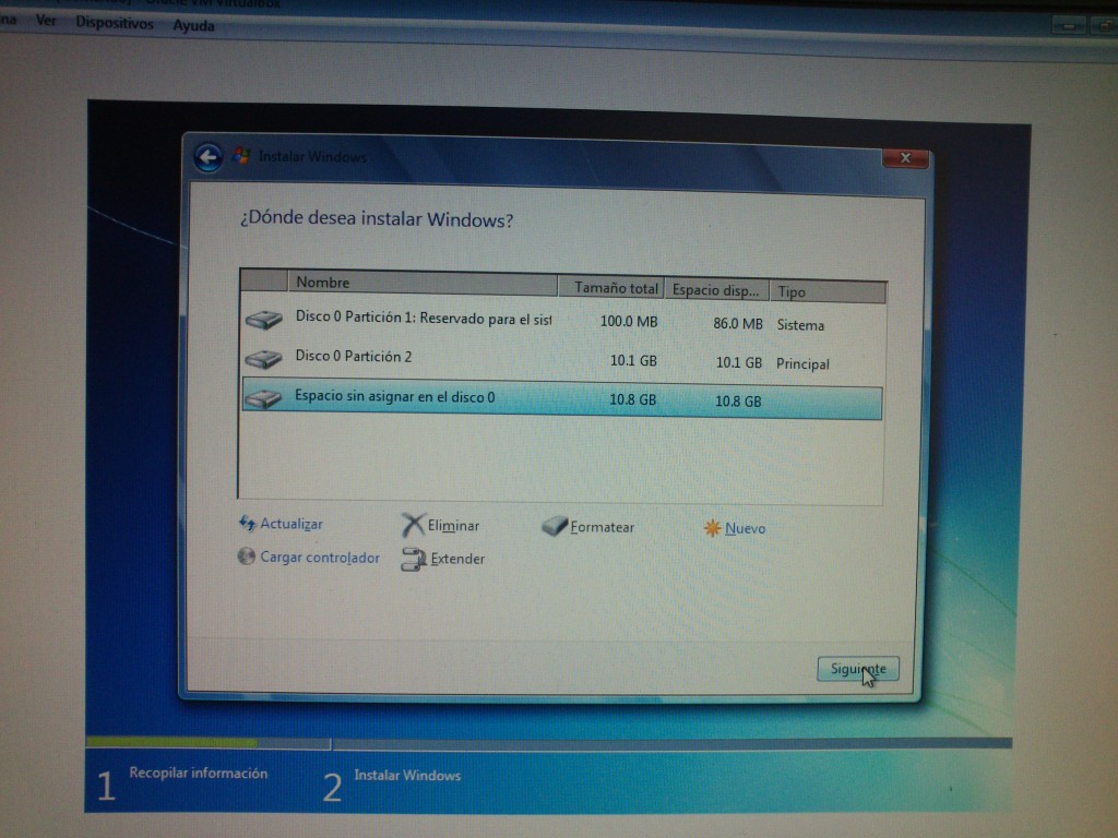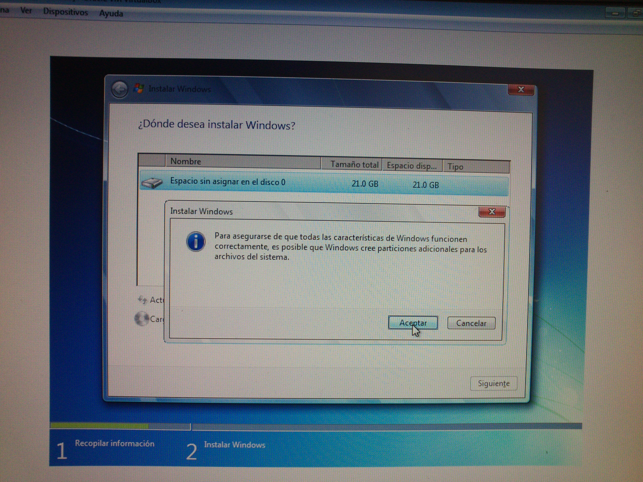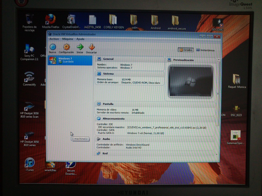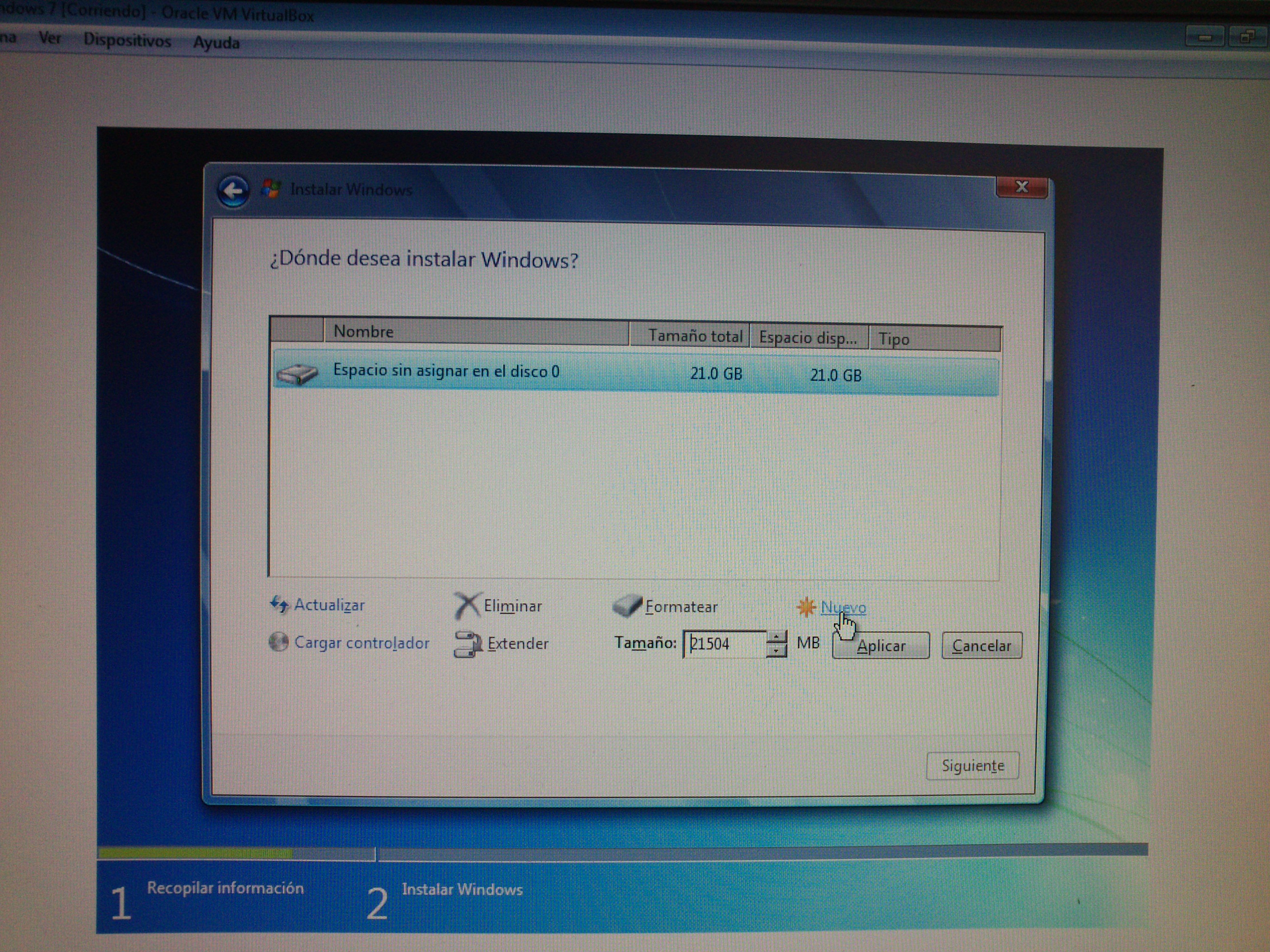 Le damos 20 GB de H.D y con esto ya tendriamos creada la «maquina virtual» para poder intalar el S.O. Una vez termiando con lo anterior, le damos a iniciar o doble click en la maquina creada para poder instalar el S.O.