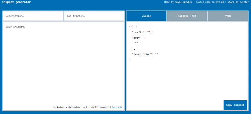 La siguiente web nos ayudará a generar los snippets del lenguaje que queramos de forma mucho más sencilla: