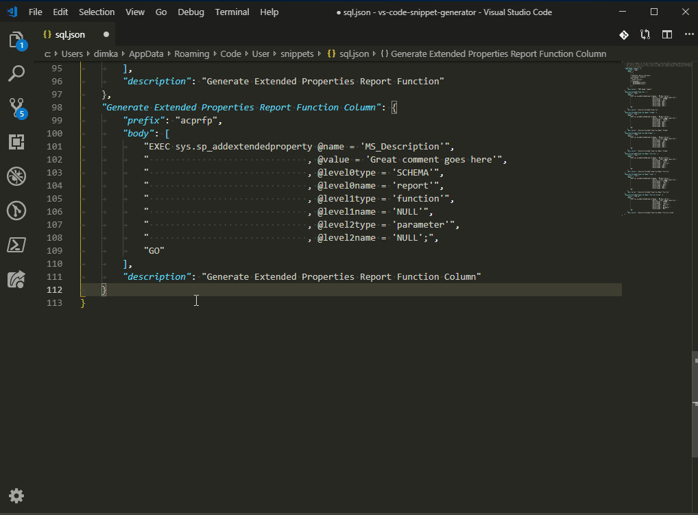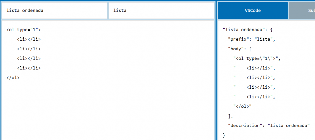Copiamos el snippet generado y lo pegamos en el archivo html.json. Ya tendríamos el snippet de nuestro código: