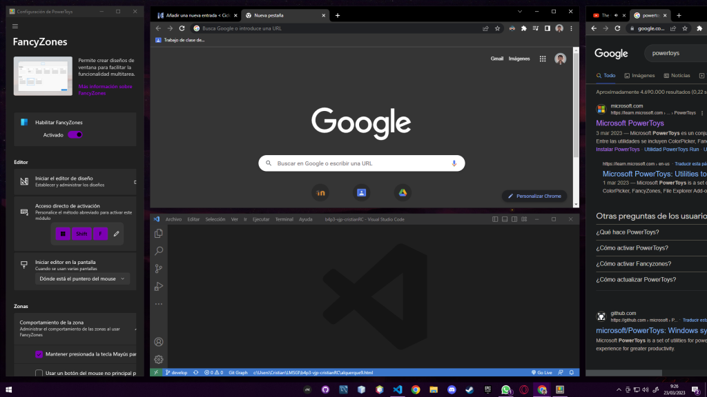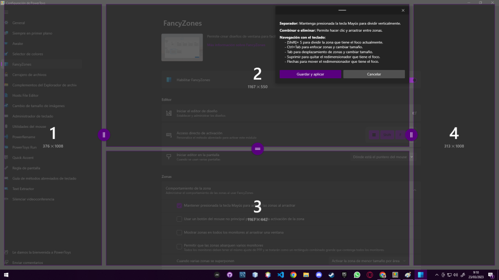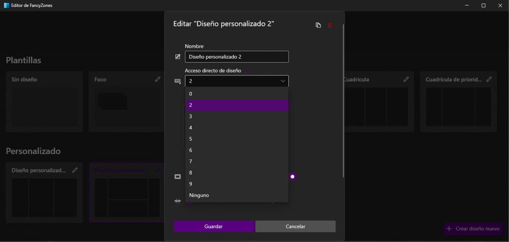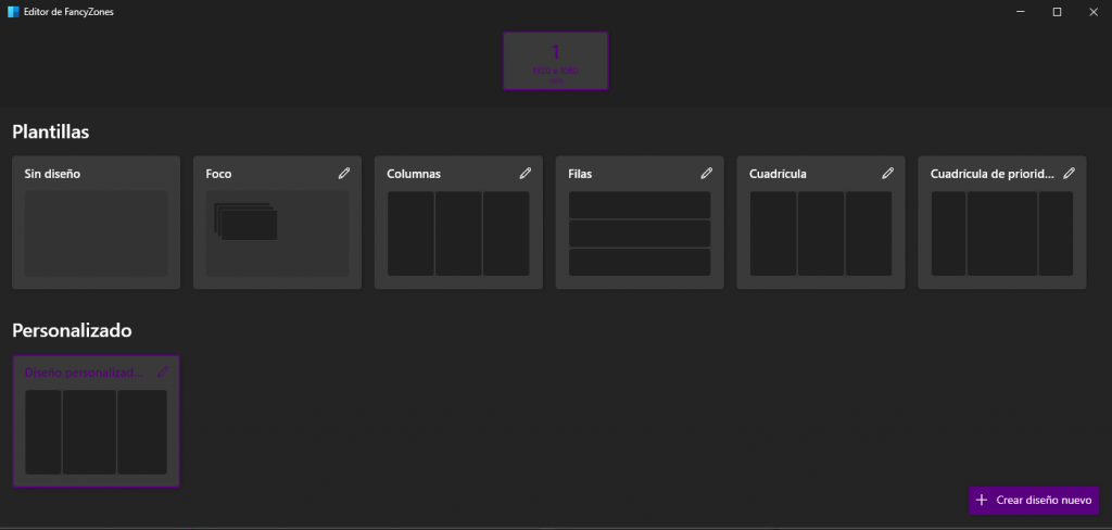 Una aplicación muy importante si tenemos una gran pantalla y queremos sacarle el máximo partido. Esta herramienta nos permite dividir nuestra pantalla en los espacios y tamaños que queramos. Tendremos que ir al programa de PowerToys y seleccionar FancyZones. Una vez estemos en su pestaña seleccionamos «Iniciar el editor de diseño». Se nos abrirá un menú como este: